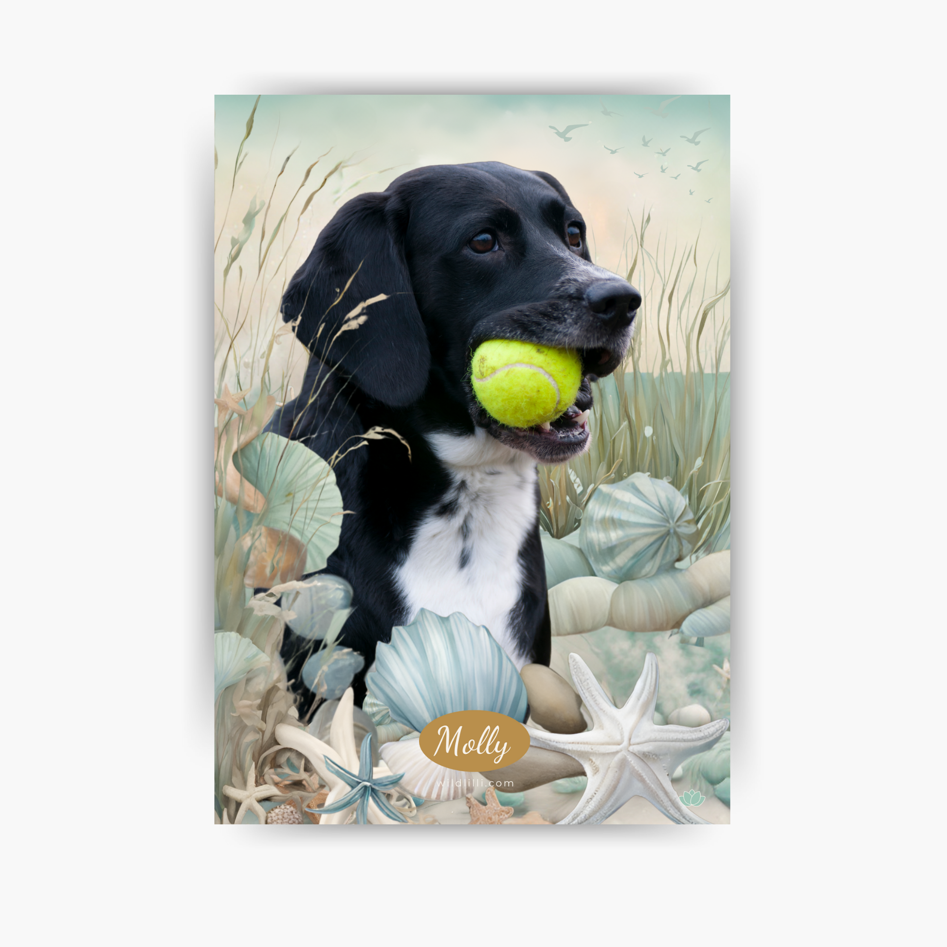 This design captures the feeling of salt air, sandy paws, and wind-tousled fur — the kind of carefree joy only a beach day can bring. With soft blues, pale sun, and textured coastal elements, it’s perfect for dogs who chased waves, watched sunsets, or simply found peace near the sea.
